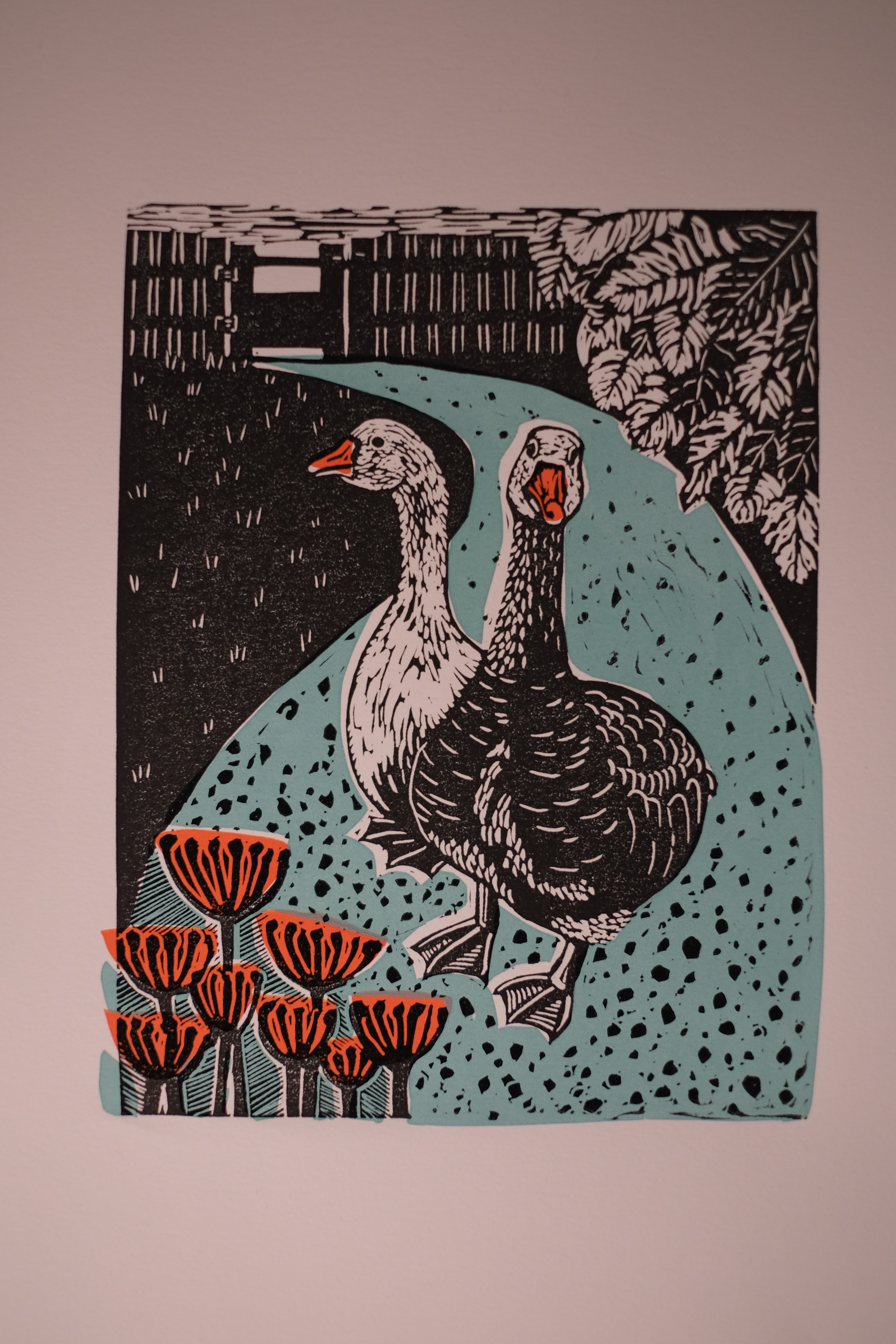 This stunning original print of two geese waddling down a garden path is a mixed media piece. Created using Silk screen printing techniques to add the blue of the path and orange of the flowers and an inked lino block has been printed over the top to add the detail.
